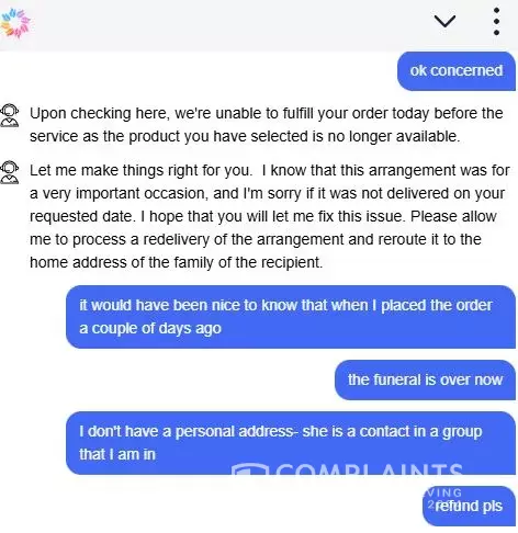 I placed an order several days ago for an arrangement to be delivered to an acquaintance's mother's funeral today at the church I specified by 10 am. When I checked on the order, it simply said unable to be delivered. I contacted the customer service chat and was told the order couldn't be delivered because the product was out of stock. The funeral is now over, and I don't have a personal address for my recipient. They had all of my information to contact me about the product being out of stock. Really, really disappointing. I got a refund, so ok, but this was an easily avoidable problem. I used to use them all the time- never, ever again.