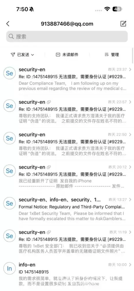 我的问题在12月20号就开始跟1xbet 沟通了,当我提交了身份以后,让我继续提交无赌博成瘾证明,我相继跑了三个医院,都以非原件,伪造拒绝,金额是49283.01墨西哥比索