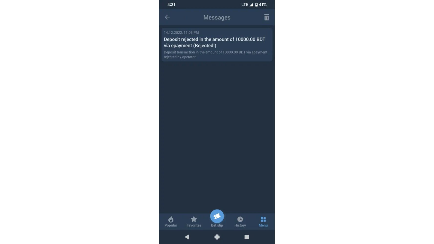 yearstarday i deposited 1000 taka by bkash. but operator rejected my deposit. i sent several mail stating my problem and proofs. but no response from support team.