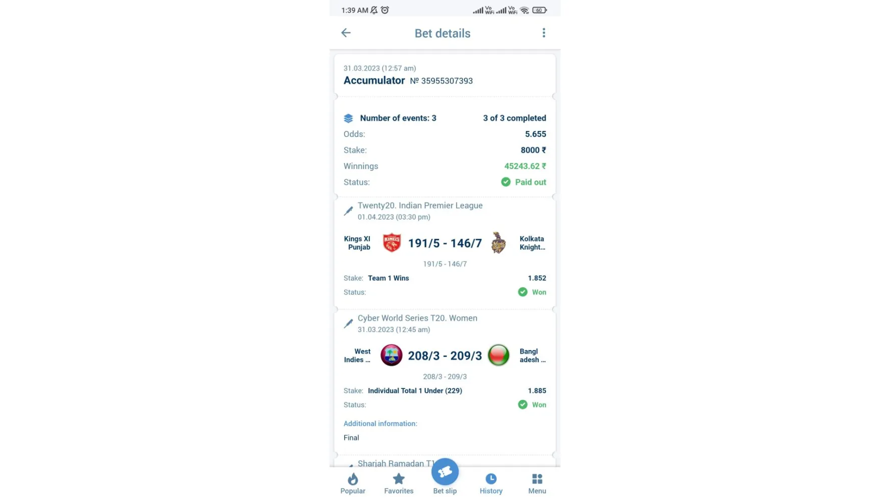 This is regarding bet slip [protected] and A/C No. [protected] in 1X bet. Team2 scored 3 Runs in first 3 balls of the 19th over and according to bet I won it ; So Status should be mark WON ; but your system marked me LOST...It is a big cheating! Scam!