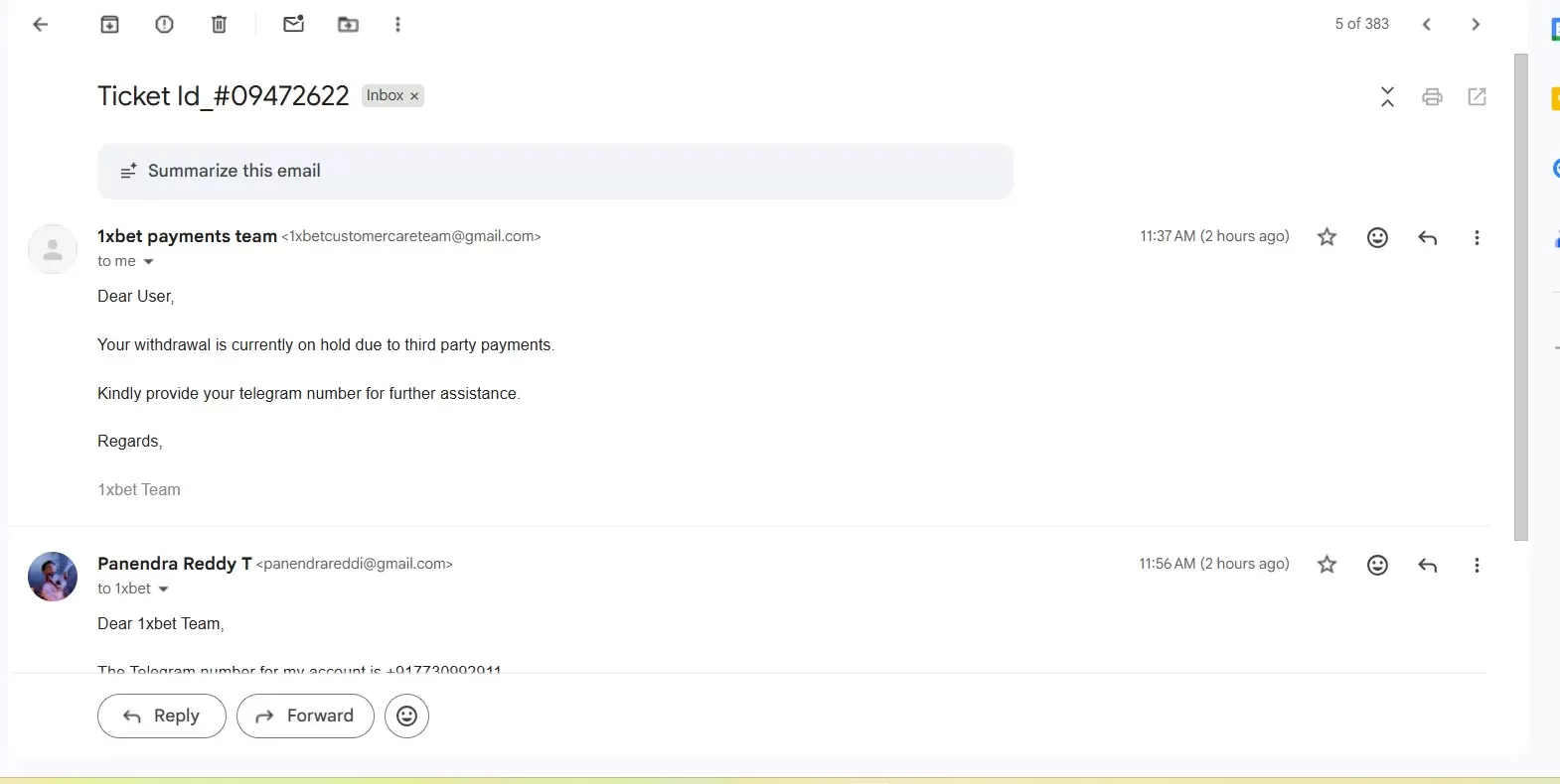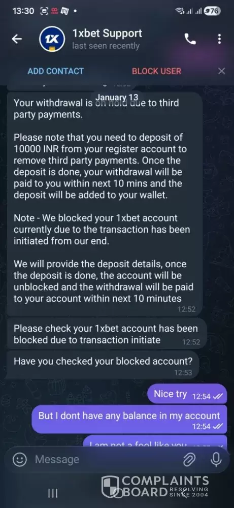 Additionally, I strongly suspect a serious internal data leak, as scammers contacted me with exact knowledge of my private withdrawal complaint immediately after I emailed official 1xBet support.