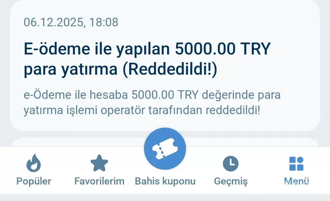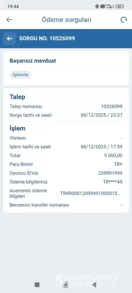Hello, Gamer ID 239091999 I have been a 1xbet member for 5 years. I have made deposits totaling around 1 million TRY and I also have VIP membership status. I made a deposit of 5000 TRY to xbet using the bank transfer fast method. Transaction date and time : 06/12/2025 / 17:59 The money was transferred from my bank account to the IBAN, bank account...