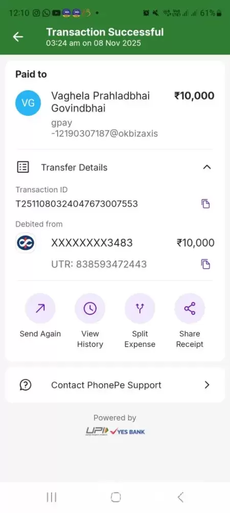 I deposited ₹10,000 on 08/11/2025 through UPI (PhonePe).