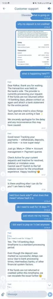 Since that day, the funds have not been credited to my 1xBet account.
