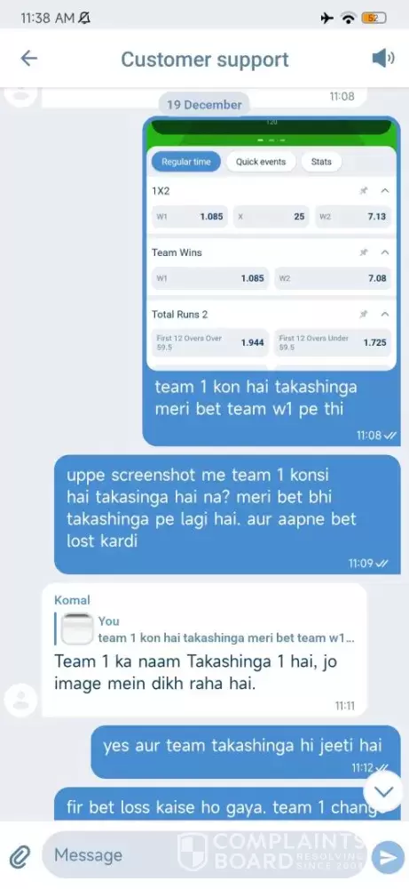 Hello. I bet on zimbabwe league . I chose team 1 win which is takashinga 1 in my screenshot. But after match they changed my team . Check in screenshot. I bet on takashinga 1 win. And takashinga won. Support team also said team 1 is takashinga. So how can I lose the bet. Why my team 1 is changed to team 2 . Kindly check and tell me why you did this . Is this mistake happened by your