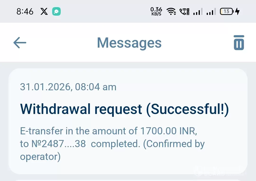 I would like to raise a complaint regarding my withdrawal transaction. My 1xBet Account No is [protected] and Username is SMRUTI86. Last night I placed a withdrawal request of Rs.1700 to my savings bank account. Today morning at 8:04 AM, your operator confirmed that the transaction was successfully completed. However, till now the amount has not been credited to my bank account. This delay is causing inconvenience and concern. Kindly verify the transaction status at your end and resolve this issue at the earliest by ensuring the amount is credited or providing proper transaction details. I request your prompt support in this matter.