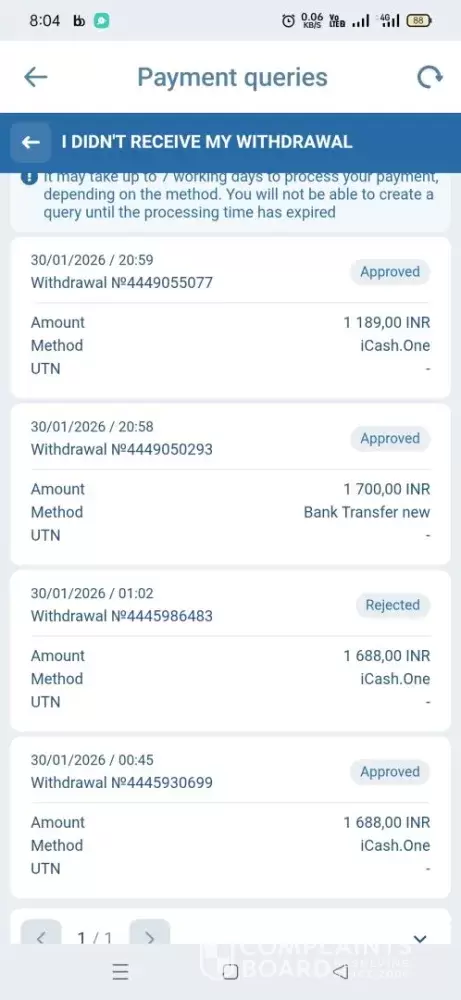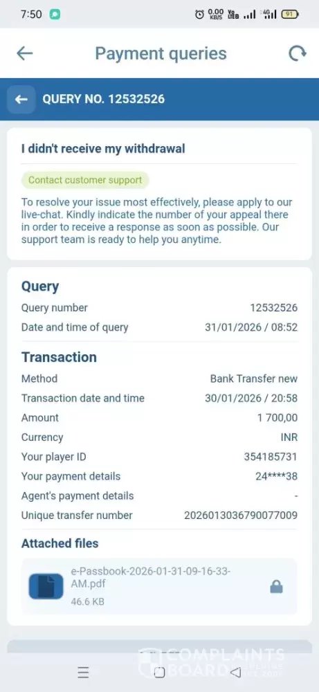 Here I have attached the bank statement from 29th January 2026 to 1st Feb 2026 as well as screenshot of complaint raised on 1xbet site.