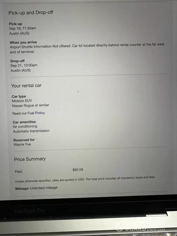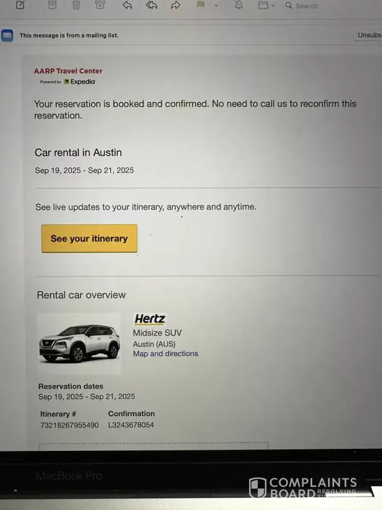 The Hertz rental booking was confirmed on August 23, 2025, approximately one month before the trip on the AARP website. The pickup was charged 3 times over the quoted rate and an additional fee to add a second driver (25 years older). Rental Austin Airport 09/19/25-09/21/25. Itinerary # [protected], Confirmation# L3243678054 I have added a driver with...