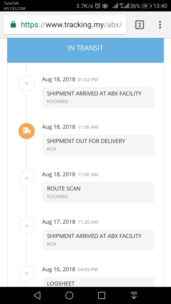 out for delivery pada 23/8/2018 tapi dihantar pada 24/8/2018 (bermakna barang tersebut dibawah pulang ke rumah)