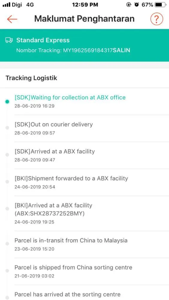 KES YANG SAMA BERLAKU KEPADA SAYA, TRACKING NOMBOR SHX00459885BMY, DI HANTAR KE ABX SANDAKAN PADA 20.12.2019, TETAPI TIDAK TERUS DI HANTAR KE BATU 6(LOKASI ALAMAT PENERIMA), LOKASI PEJABAT ABX HANYA DI BATU 4, JARAK CUMA DUA BATU SAJA DARI PEJABAT ABX, MEREKA SIMPAN BARANG TERSEBUT SAMPAI 06.01.2020, KALAU YANG KES KINABATANGAN LAGI LAH MEREKA TAK MAU HANTAR, KPDNKK SEHARUSNYA MENGAMBIL KES INI UNTUK SIASATAN AWAL DI PREMIS ABX SANDAKAN, DAN PEMERHATIAN HARUS DI LAKUKAN KEPADA SEMUA STAFF FRONT DESK DAN PEGAWAI YANG BERTUGAS DI ABX SANDAKAN HENDAKLAH DIAMBIL KETERANGANNYA KERANAN BANYAK ADUAN YANG RASMI DAN TIDAK RASMI DI TERIMA BERKENAAN PERKHIDMATAN ABX DI SANDAKAN, BARANG-BARANG YANG DI KIRIM TIDAK DIHANTAR DAN DI SIMPAN DI GUDANG PEJABAT BATU 4. BERBEZA DENGAN SYARIKAT KURIER LAIN, BARANG TERUS SAMPAI KE ALAMAT YANG DI NYATAKAN OLEH PELANGGAN. UCAPAN TERIMA KASIH SUDAH MEMADAI UNTUK PERKHIDMATAN YANG BAIK. INI BERBEZA DENGAN BUDAYA YANG DIAMALKAN DI ABX BATU 4, PEKERJA KAUNTER TIDAK DAPAT MELAYAN PELANGGAN DENGAN BAIK, WALAUPUN PADA DASARNYA PELANGGAN ADALAH RAJA DALAM PERNIAGAAN, SEBAB MEREKA YANG MEMBAYAR ANDA, DAN ANDA HANYA WUJUD JIKA PELANGGAN MEMBAYAR ANDA. JANGAN SOMBONG KEPADA PELANGGAN, NANTI REZEKI TIDAK BERKAT. JIKA SELEPAS INI MASIH ADA ADUAN LAGI BERMAKNA BELUM ADA PENAMBAHBAIKAN PERKHIDMATAN KAUNTER, DAN TINDAKAN SELANJUTNYA WAJIB DI AMBIL UNTUK MEMANTAU SYARIKAT KURIER INI. PERKHIDMATAN BERKUALITI BUKAN HANYA DI PEJABAT KERAJAAN SAHAJA TETAPI JUGA DI SEKTOR SWASTA, JUGA AMAT PERLU. DAN TINDAKAN KERAS BOLEH DIAMBIL OLEH PIHAK BERKUASA PEMANTAU TERMASUK SPRM DAN KPDNKK YANG MENGUATKUASAKAN AKTA YANG DI GUBAL UNTUK MELINDUNGI PENGGUNA DAN KETIDAKCEKAPAN PERKHIDMATAN SWASTA. KITA SAMA-SAMA MELIHAT SELEPAS INI ADAKAH ABX SANDAKAN ADA PERUBAHAN ATAU TIDAK.
