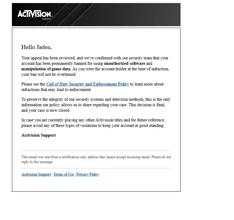 I respectfully ask that Activision review my case and reconsider my permanent ban. I would be very grateful for any opportunity to return and continue playing fairly.
