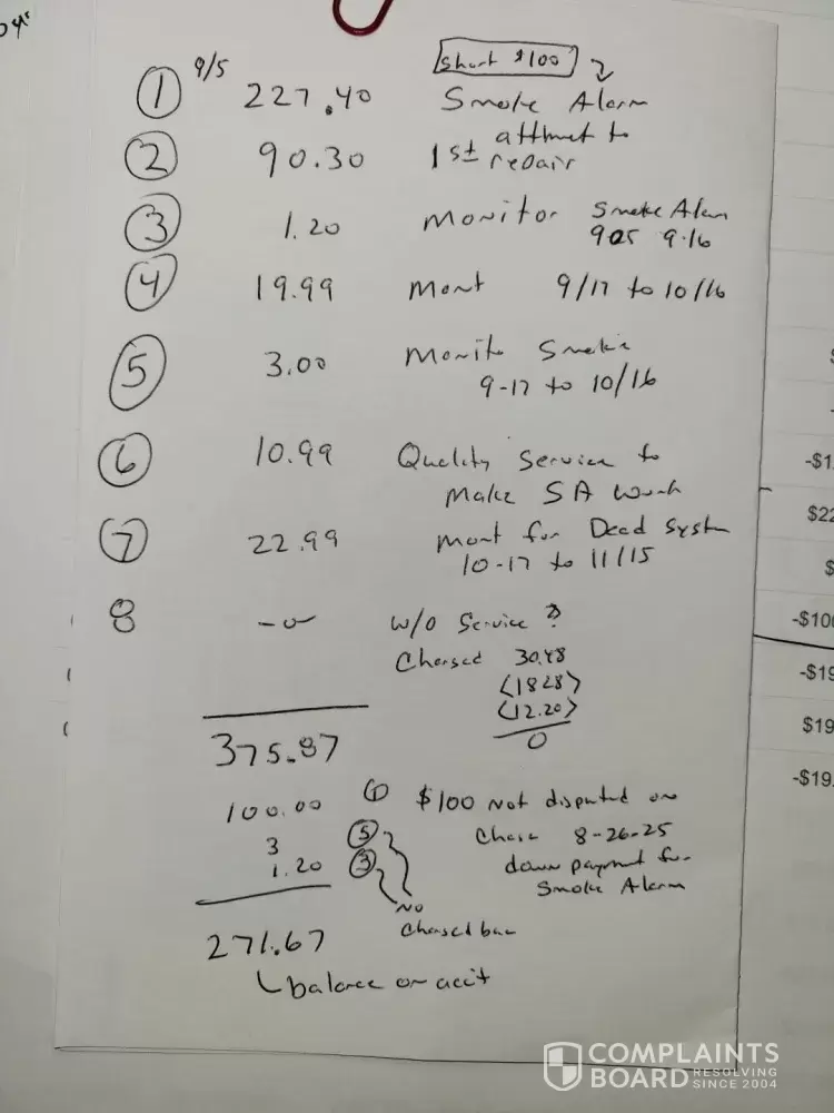 We added a dining room and wanted to add a smoke detector in that room, and have it connected to our ADT system we purchased in 2005. I called on Aug 26 of 2025 and ordered one paid the $100 downpayment of the $227.40 bill. I paid the balance on 9/5 when the tech arrived. He was not able to get it SD connected to my current ADT system. He said a 2nd tech would come and install it. I was charged an additional 90.30 for the 2nd tech to try an install, I was told I had to pay it and then would be reimbursed because the cost should be the original $227.40. They would go back and fix the bill after the SA was work. I had a third tech come because 1 & 2 were not able to make it work. I was told I had to pay 10.99 per month on 10/3 for the tech to be free and would fix the extra charges after it was working correctly. Tech 3 & 4 were not able to install it, all that happen was my motion detectors start to act up going off in the middle of the night multiple times. I spent several hours on the line with two different set of online techs trying to reprogram my system, this is now November, and more parts of my system were not working. Motion detectors not on when we were away. etc. When tech 4 was here he broke the keypad at our front door, so it no longer works. The last time we were woke up in the middle of the night, I called ADT in the middle of the night to turn off our system, and I disconnected all power to the system so we could sleep without the alarm going off. I have a balance on our account of $271.67 for the SD, tech and monitoring of our broken and dead system. I have talked to about 25 different people at ADT and they are not able to help me. The keep saying we will install a new system and give me credit back for the SA and all the charges BUT not until I agree to install a new system. I have been told by at least 3 different ADT people the new system will be free, but I don't trust them to make it right after the new system is installed.