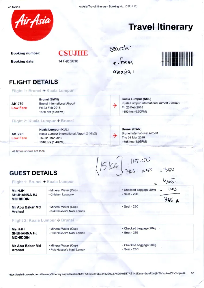 Hari ini flight saya balik dari Kuala Lumpur ke Brunei Darussalam jam 1:40 pm AK278, Seperti biasa kami datang awal untok check-in dan baggage drop. counter (Y) Airasia. sampai disana saya telah dimakluman yang baggage suami saya tidak ada dalam system mereka, padahal saya dah beli tambahan baggage pada 14.2.2018 dan telah diterima dan disahkan melalui email dari airasia dengan itu saya telah print resit pengesahan tersebut. Saya tunjokan kertas yang saya prints yg sah dari email airasia. tapi pegawai airasia cina perempuan, tidak mahu terima, malah dengan keras mengatakan tidak ada dalam system. saya setentunya terkilan sebab saya ada bukti pembelian saya, kenapa tudoh saya buat ubahan dalam tikit, bolehke buat begitu. saya suroh check balik2 mengatakan time saya beli tikit pun ada error dalam system, minta pembayaran balik2, nasib saya check email semasa tu mengatakan semua urusan diterima dan sah.