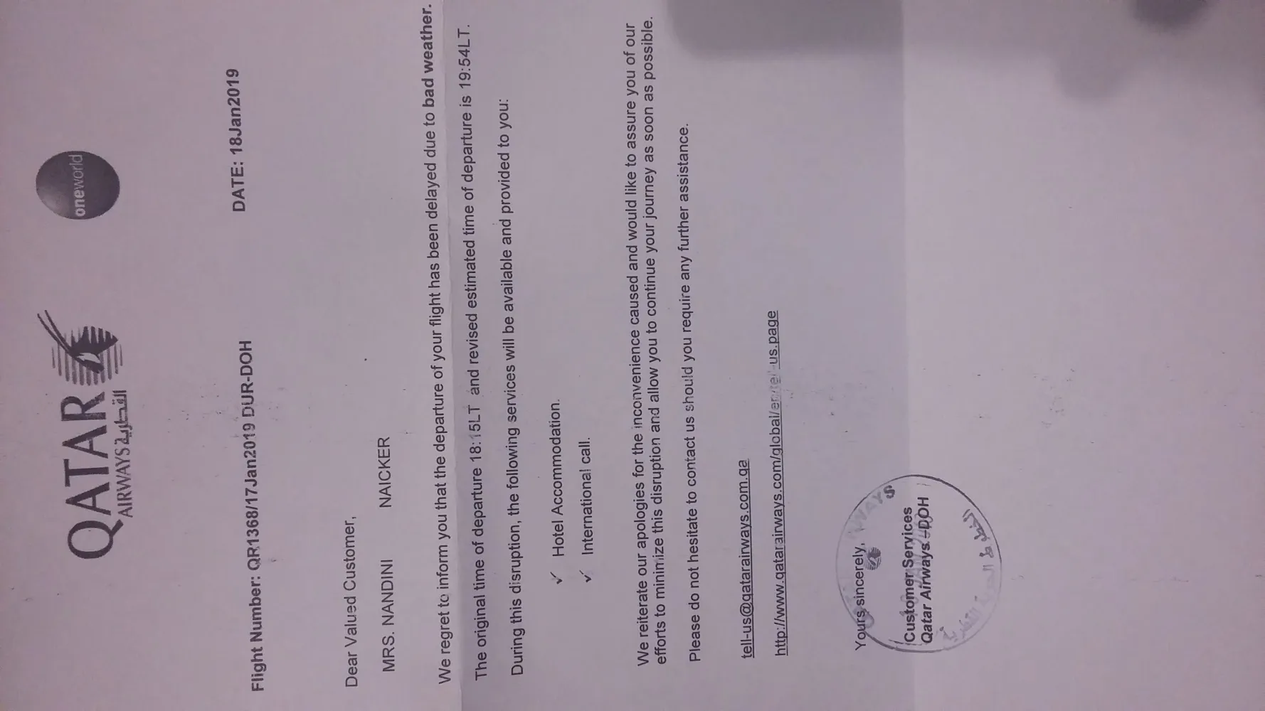 I booked flights durban-joberg - doha - lax. 17 jan 2019.