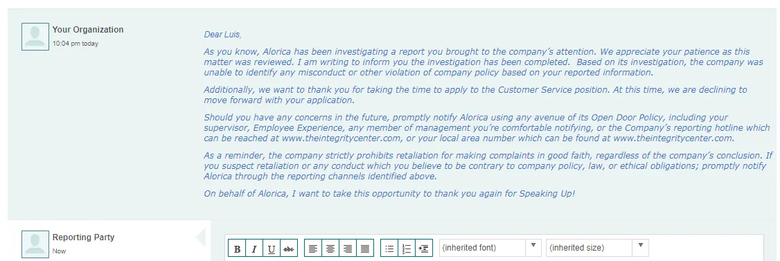 As a reminder, the company strictly prohibits retaliation for making complaints in good faith, regardless of the company’s conclusion. If you suspect retaliation or any conduct which you believe to be contrary to company policy, law, or ethical obligations; promptly notify Alorica through the reporting channels identified above.