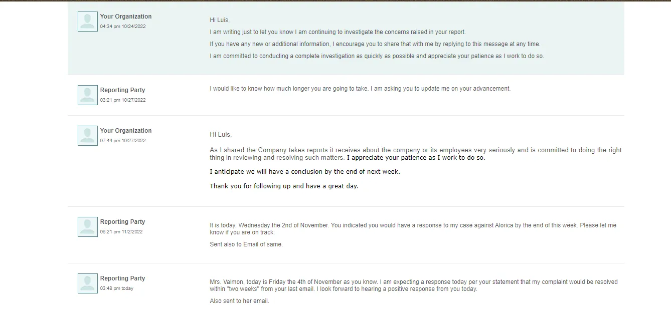As you know, Alorica has been investigating a report you brought to the company’s attention. We appreciate your patience as this matter was reviewed. I am writing to inform you the investigation has been completed. Based on its investigation, the company was unable to identify any misconduct or other violation of company policy based on your reported information.