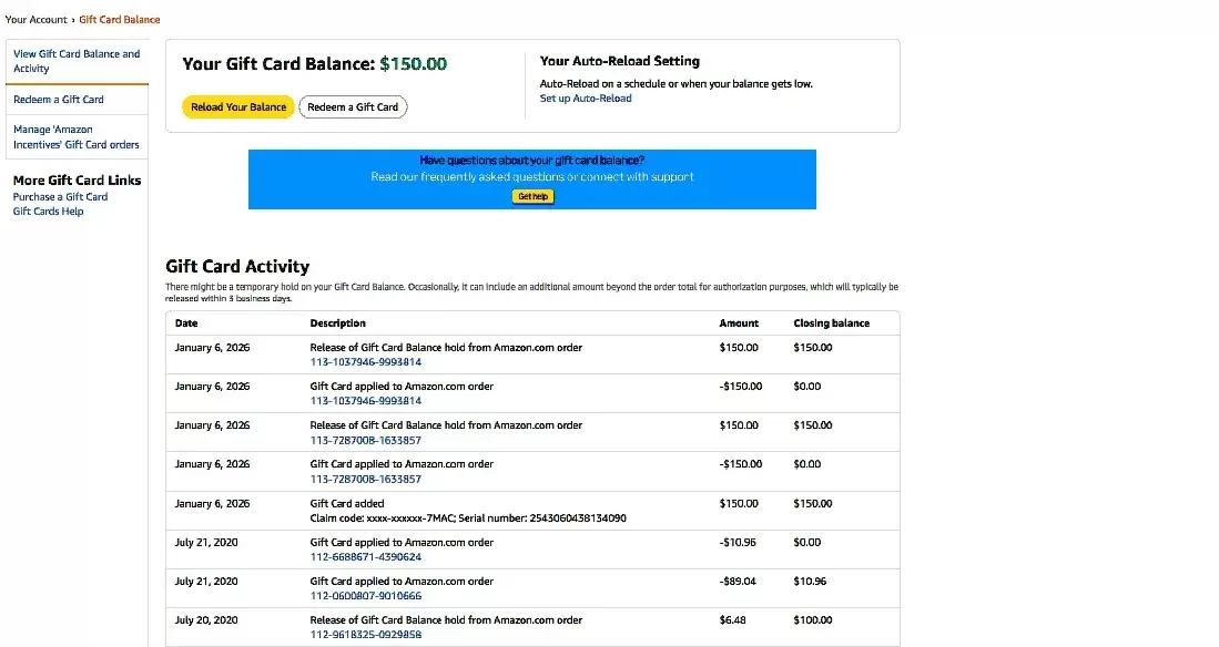 A friend sent me e-gift card to purchase some items for the New Year and because I am unable to go to the store to purchase items due to an illness. When I opened my email and clicked on the gift card, I was immediately transferred to the official site of Amazon and told to redeem funds to account which, I found out shortly after, that I was banned for. The reason that they provided after numerous times of me asking was based on them violating their own policy.Several photos show packages left at wrong address, the driver not delivering package,constant complaints on delivery in this area. I haven't used this account since 2020 so, 2026 was the first time accessing it after all those years. They took my giftcard, been ignoring my messages even when I asked if I could have it shiipped to a locker for pickup. They then start rerouting messages after I asked them to refund the $150 back to the original senders account or send me a check and they have refused wither. It is now the end of January and I have not received anymore response and they still have my egiftcard.