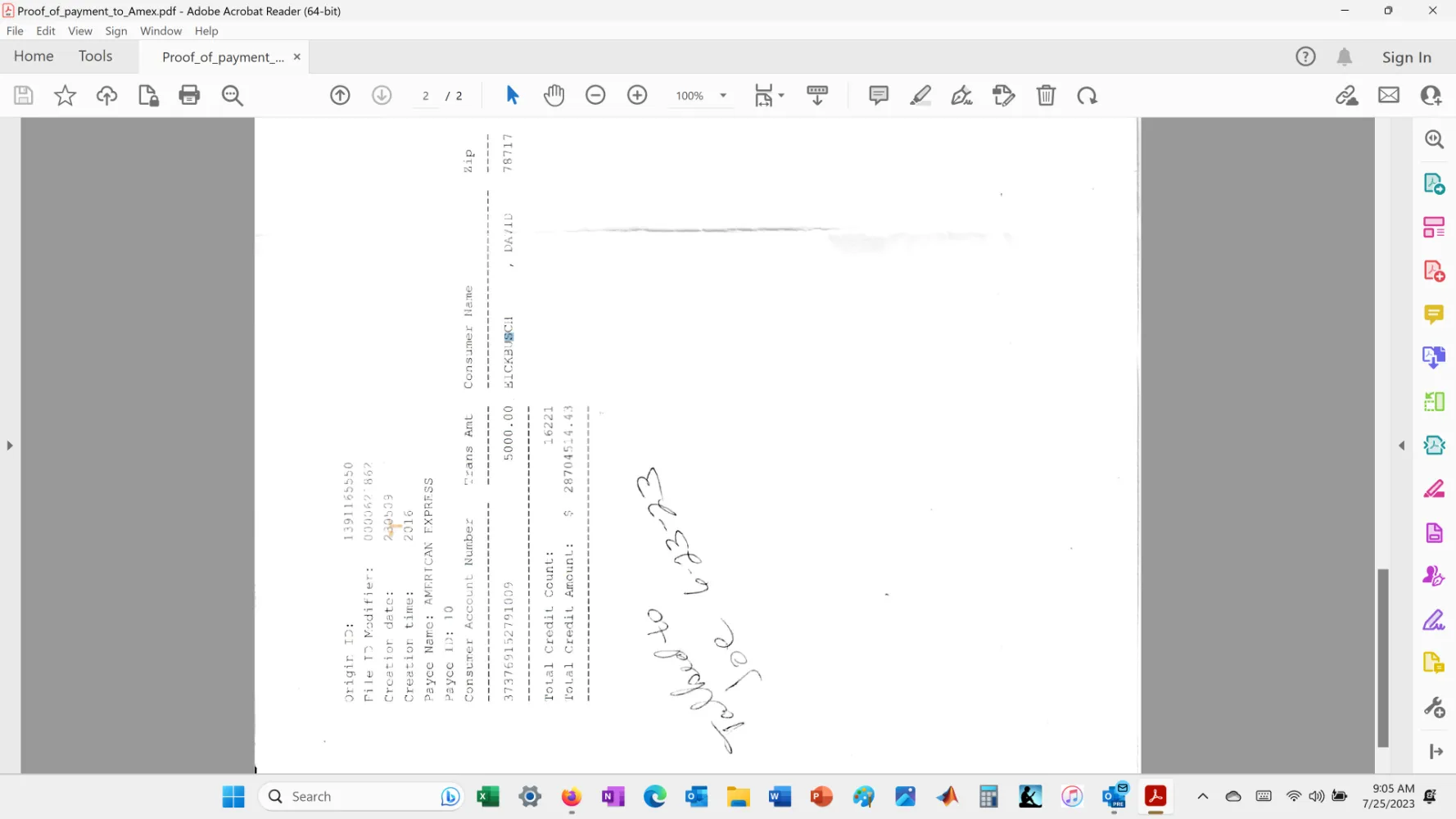 I paid my bill in August of 2019, in the amount of $904.08, and American Express has denied receipt of the payment stating I owe them $903.71, causing me to have a negative rating on the deadly credit reporting agencies. This has persisted to exist even though I have sent numerous faxes, and a return receipt request, with a copy of my bank statement indicating the payment to them.