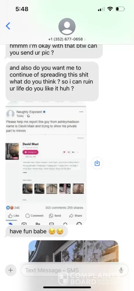 A person from the site is black mailing me. They set up a fake account showing me with photos of a dick ( that isn’t mine) and are saying I showed myself to minors. They contacted me and asked for my first name which I gave them then they sent a screenshot of a fake profile with fake pictures and one picture of me and said I was exposing myself to minors and threatened me that they would spread it to my friends and family