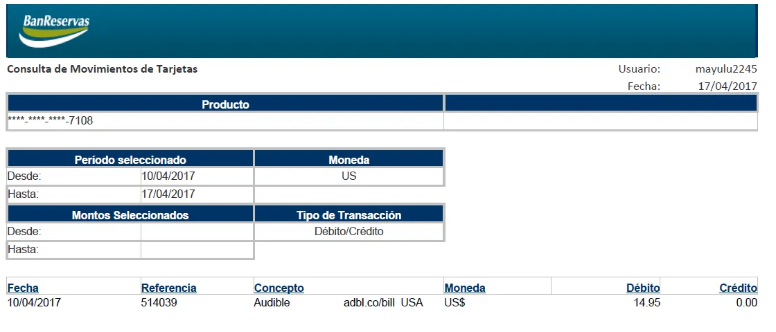 Por favor necesito que se me devuelvan los us$14.95 que se me han cargado en fecha 04/10/2017. Mi tarjeta de credito es visa, el nombre del banco es Banreservas. yo soy de Republica Dominicana.