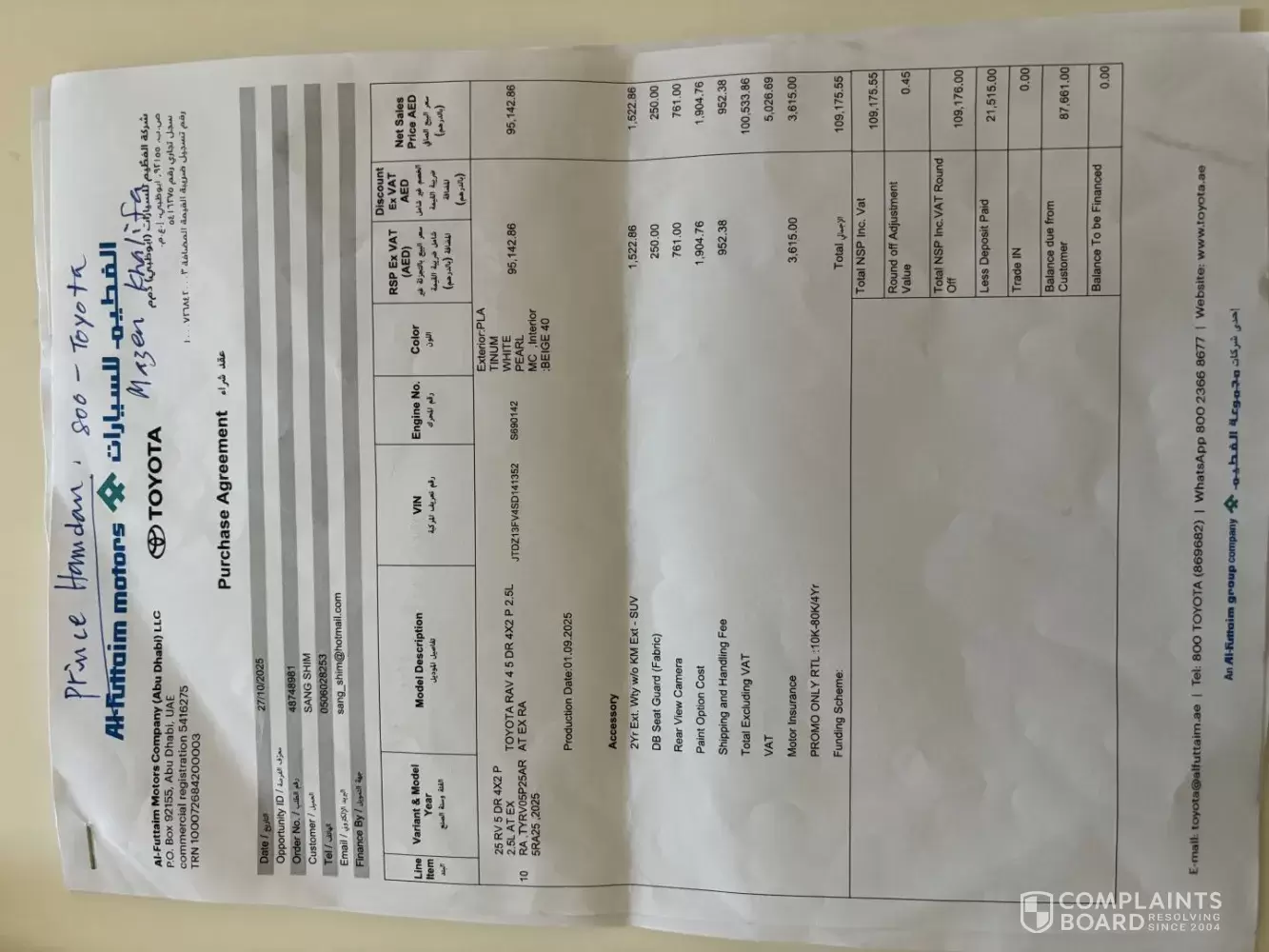 I am writing to report a business misconduct and to make a request for reimbursement of AED 1600 related to the purchase of my Toyota RAV4 from the Airport road showroom in Abu Dhabi on 27 October 2025. Please see attached invoice. During the negotiation process, 2-year extended, 5-year warranty worth of AED 1600 be provided free of charge instead of the...