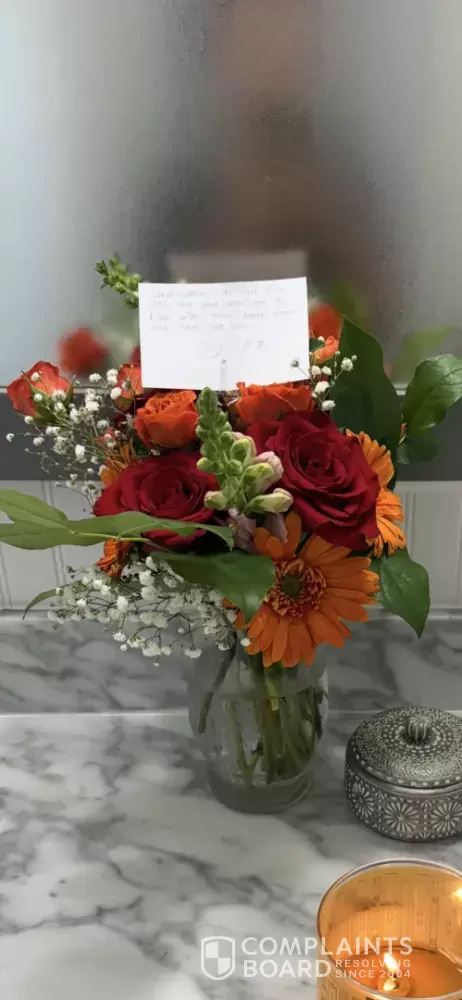 I called to place an order for the above item. Blue Vase, Blue Ribbon Blue Flowers with Yellow Roses and Lillies. I asked that it be upgraded as the original order was $49.99. What was sent was a clear Vase, Ugly Ribbon that was wrinkled, Red roses that were fully open, The bouquet was very unprofessional and not what I had ordered. My bank account was charged $93.00 I've contacted them on numerous occasions and even provided a picture of what was sent, their resolution before being put on hold indefinitely was to credit an account with a $10.00 credit on a future order. Trust me, there will be no future order from this company. They knew of my complaint said they would resolve it and never even bothered to call. Attached is a picture of the $93.00 flowers