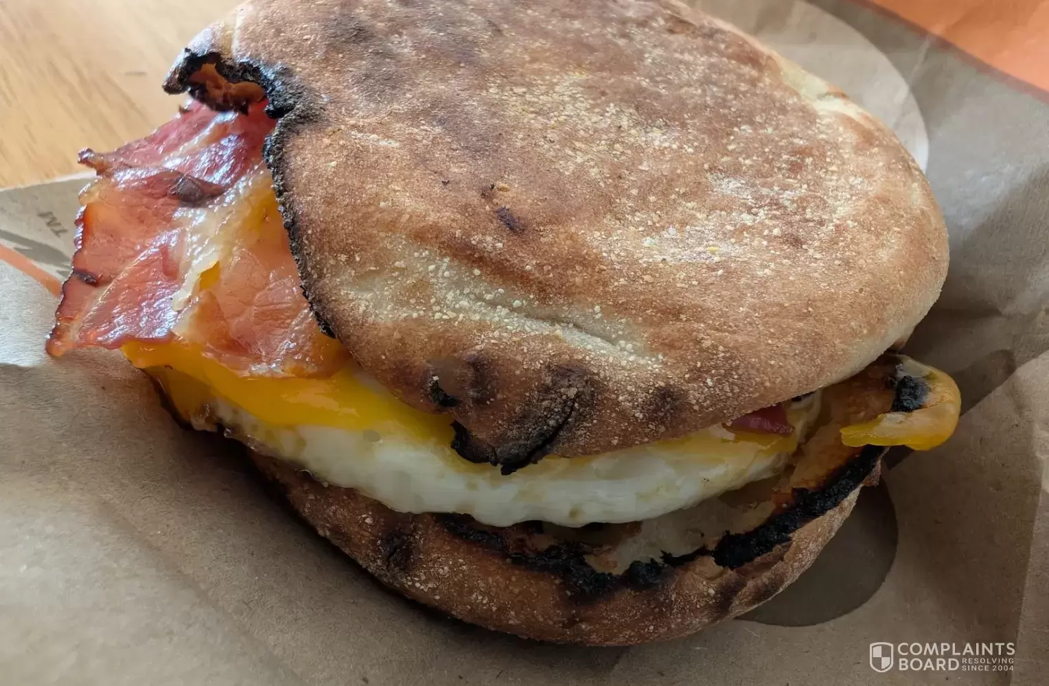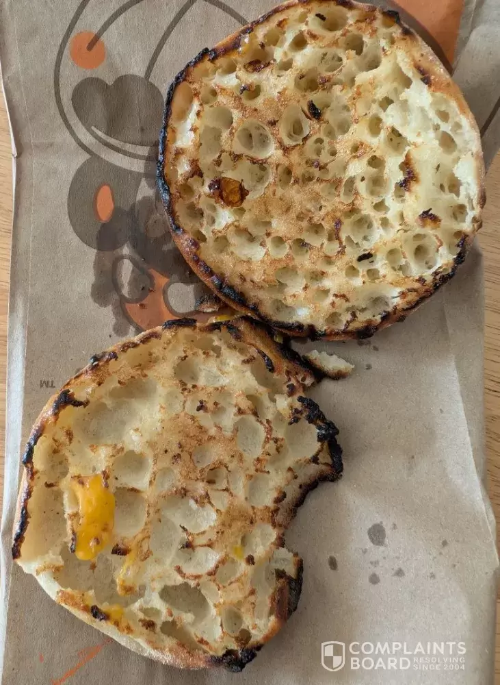 September 17, 2025 at Powell River, BC V8A 3B6 about 4:30 pm I ordered an English Muffin Bacon & Egger to go. After coming home, I found a seriously over-toasted muffin placed inside. The whole circle rims of both halves were totally burned black, one of the half’s edges was even fragmentary and the inner surface of those halves were filled with many little...
