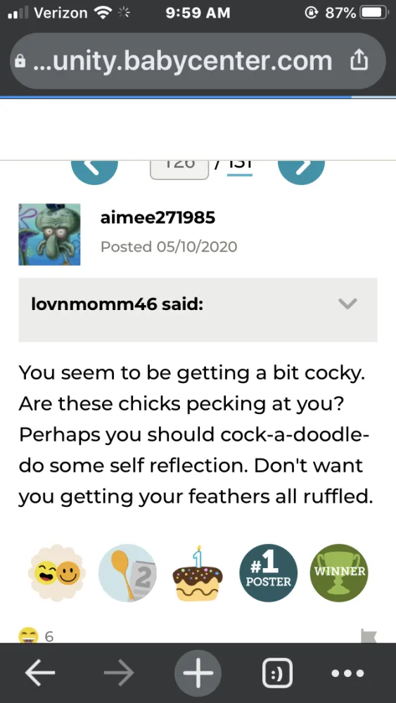 This is the WORST place to go if you are looking for a site with supportive, welcoming women. These women are a nightmare and will attack over NOTHING. I posted on a thread that I later realized was old. Figuring I would get no responses I deleted my comments only to wake up to nasty messages with women accusing me of "stirring the s*** pot" (i was told to lick the spoon) and screenshooting the fact that I had commented. When I responded, all my responses were (of course) reported and I was given a violation. WTH? Crappy site - try whattoexpect instead.
