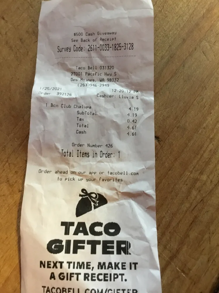 The sign said $3.49 for a bacon club chalupa. At the window I was charged $4.19 plus tax for a total of $4.61. I mentioned the price discrepancy, they looked at the receipt and said it was $4.19 plus tax. I told them twice that their sign said $3.49, but they refused to go outside and look.