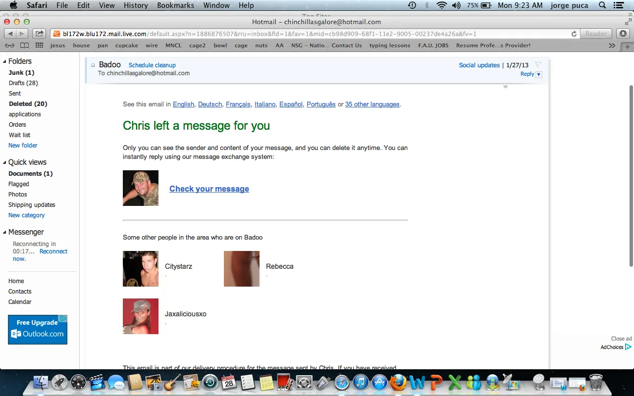 I have never joined or even heard of Badoo. I got an email saying, "My full name, Chris left a message for you. Check your message here." I am married and have never joined any such site, and certainly not this one. They somehow got my first and last name, email address, etc. I do not even have a Facebook account, so I don't know how they got my information. I am extremely angry, this is identity theft and it could cause marital fights. If my husband would have had this email and I found it there would have been Hell to pay! Luckily my hubby was understanding and just asked me about it, but most people wouldn't be so understanding.