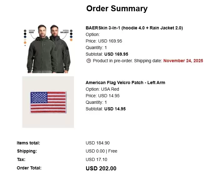 Great advertising lures people to the site. Products are appealing. Once ordered, though, everything breaks down. Have 3 separate orders (way to go sales system on suckering me into supplemental purchases with immediate, expiring discounts!). Initial order was a baerskin 3-in-1 (hoodie 4.0 + rain jacket 2.0) with american flag velcro patch - left arm. About $202 with tax. Order & Pay Date: November 19, 2025. Shipping date stated: November 24, 2025. No information since then and no movement on the order.