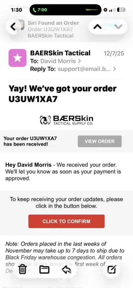 Bearskin sent me 2 comfirmation emails, said they would send me another email when they ship my orders. Also they sent me after another email so I could tract my Orders for the time being, the order numbers didn't work. I ordered the bearskin 4.0 hoodie on December 16th, hoping to receive it before christmas for my husband. Now it's December 22, and still...