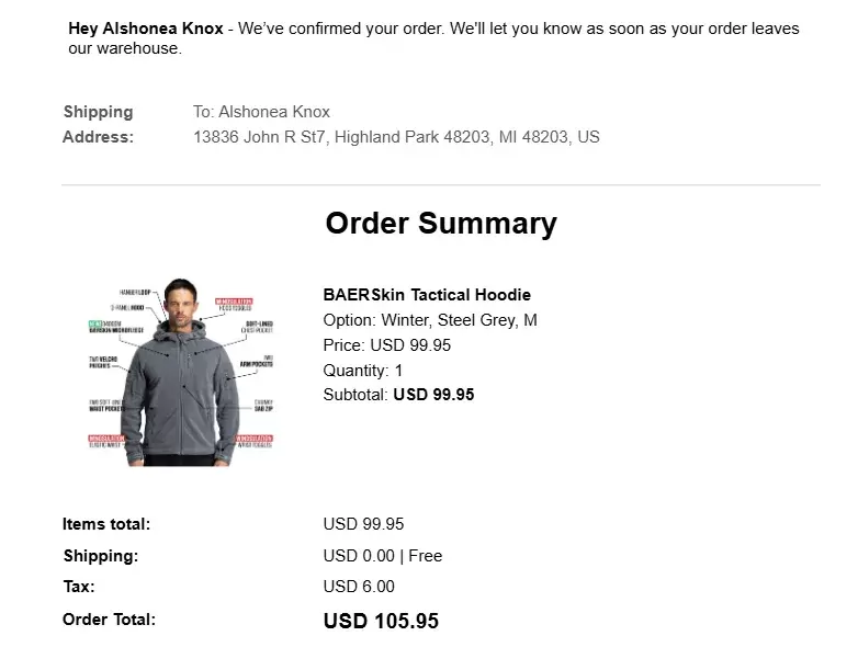 I ordered the Baerskin hoodie and outer shell combo on December 7th. My Discover charge was immediately charged for 180.17 and I received the we have received your order email with another email with a tracking link a day or so later. The tracking link just said shipped and sent you back to the order more stuff page it never offered to show where it wa...