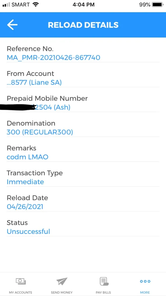 I attempted reload 500php to my prepaid mobile number [protected] using my BDO app in April 15, 2021 at around noon time.