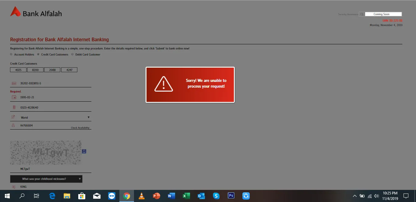 Its really a pathetic and faulty servics of alfalah online banking. I'm trying to raise my online registeration problem through credit card profile on helpline, email and live chat but no one give a suitable answer and even my mobile charges have gone to peak because of your helpline contact. According to your last email, I have called on helpline and representer told me after hearing my issue to call with your register number and when I called in the evening with the registered number than representer told me to call in morning because I have no server access at this time to see your profile and still they did'nt update my email on my credit card profile. I'm struggling with your bad service from last three weeks and I'm totally disappointed. Everyone said its over internal issue and you need to try in one to two days but 3 weeks are passed away and problem is still exist. If this problem is a long lasting and your IT server department have no capabilies to resolve it soon then tell me I can take some other step for better service from some other organization.I have attached a recent screenshot with date and time.