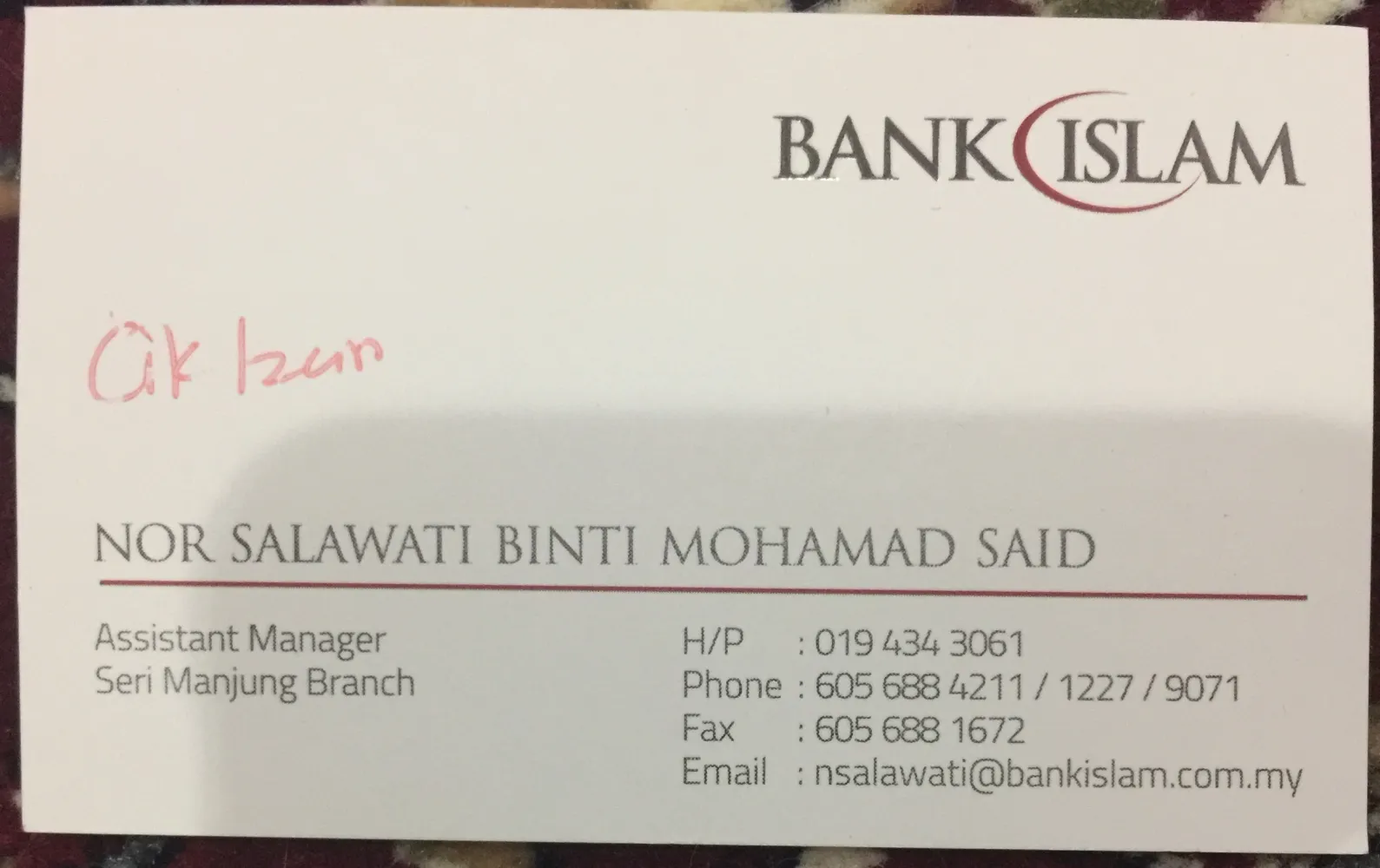 Saya Puan Maziah Mohd Ali mempunyai akaun home loan dengan Bank Islam.Pada 1 August 2018, saya ada bersama suami ke cawangan Bank Islam Seri Manjung Perak untuk pertanyaan berkenaan refinance home loan.Kami berjumpa dengan Personnel Pn Nor Salawati Mohamad Said (Assistant Manager Seri Manjung Branch) dan membuat pertanyaan berkenaan refinance.Beliau pada mula melihat rekod kami dikomputer dan yakin kami bole proceed dgn pemohonan.Cuma beliau agak mengeluh kerana pemohonan saya kali ini menggunakan akaun syarikat sebagai dokumen pendapatan.Tidak seperti sebelum ini saya gunakan slip gaji lebih mudah utk diproses mengikut kata personnel tersebut.Banyak proses & paper work kononnya.Beliau arahkn saya utk whatsapp gambar terkini rumah.Semua dokumen saya telah sediakn dan email kpd beliau pada hari berikutnya.Kebetulan hari yg sama saya ada juga submit permohonan refinance dgn Bank Rakyat.Selepas whatsapp saya menunggu hampir seminggu utk Pn Nor Salawati whatspp saya untuk feedback berkenaan pemohonan tetapi tiada apa whatsapp diterima sehingga saya terpaksa whatsapp & bertanya sendiri kepada beliau.Beliau memberi alasan sedang bercuti & balik bercuti akn semak dokumen.Sehingga lah pada Khamis 9 August beliau bertnya berkenaan income tax kemudian kembali senyap tiada jawapan atau invitation utk saya isi borang & sebagainya.Selasa 14 August 2018 saya mendapat maklumbalas dari Bank Rakyat refinance saya lulus & saya agak hairan kenapa sehingga itu Bank Islam tiada jawapan.Saya akhirnya whatspp Pn Salawati berkenaan status refinance saya & akhirnya baru beliau call saya & menyatakan pemohonan refinance saya gagal dengan alasan monthly income tidak layak untuk pemohonan refinance.