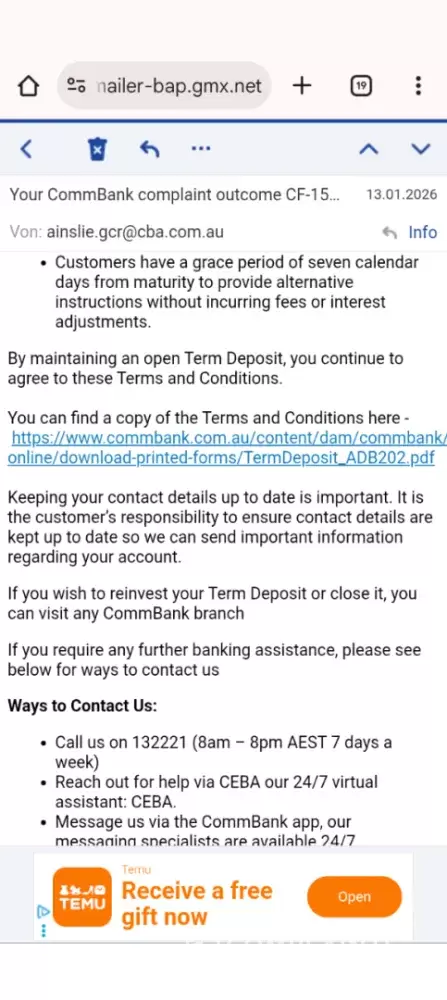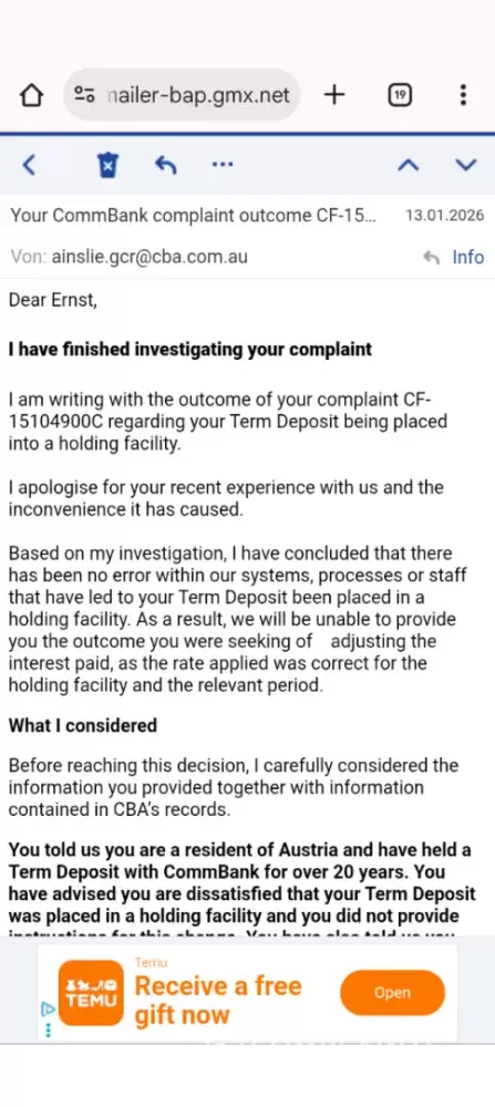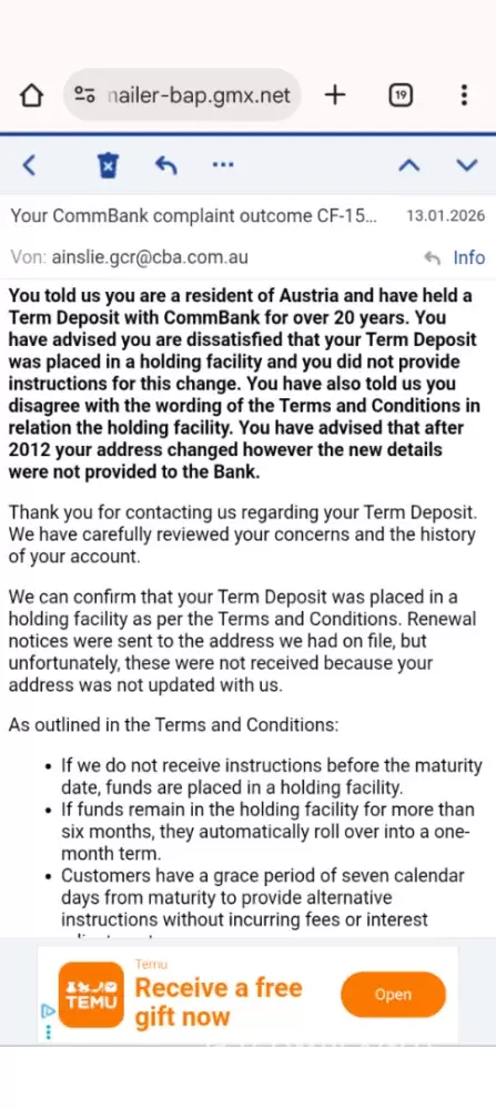 Term deposit was fixed from me for one year. Commonwealth Bank Changed that into a Holding facility despite of their renewal notice, that If I do nothing, they will renew it automatically for the same Term ( See Attachment). Afterwards Commowealth Bank fixed a one month maturity. That was instead their own Rules ( See Attachment ), that they would do that...