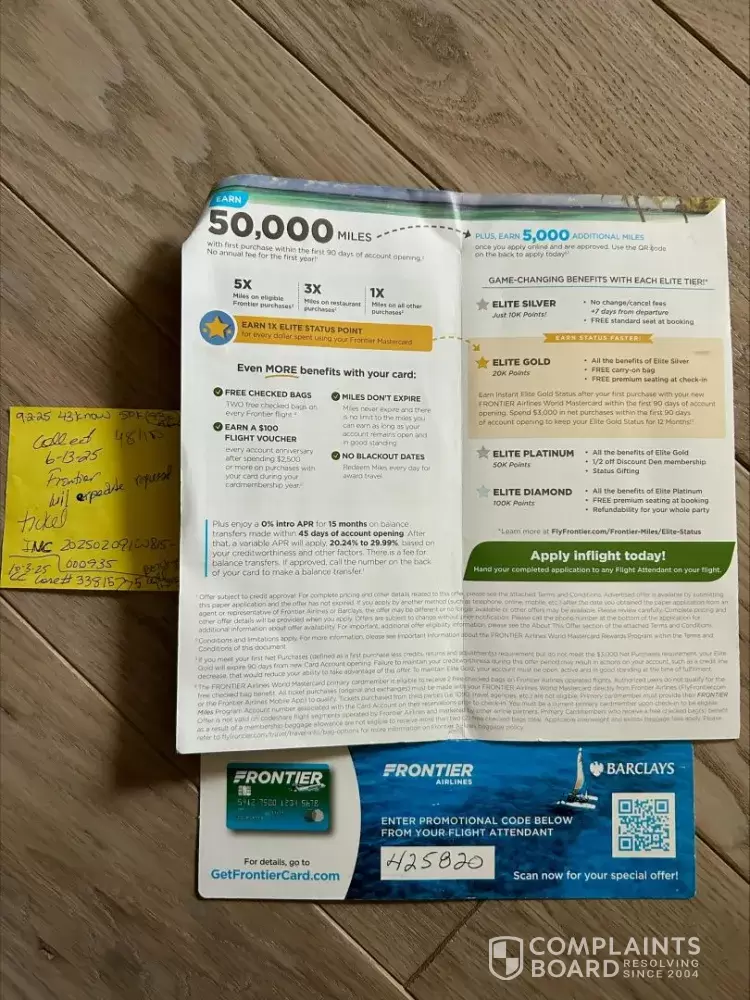 While flying frontier airlines I was given brochure for credit card application with code 425820 to apply once meeting requirements, I would get 55000 miles. I applied per their instructions and they entered my application as a 20000 miles and $200 statement credit, which when converted to miles, is 40000 miles and not 55000 as the promotion stated. I had called them multiple times, including 6/12/25, 9/2/25, 10/3/25, 12/11/25 and 12/12/25. They created many cases to finally tell me that, at the time of application they sent me disclosures stating 20k miles and $200 statement credit was the promo and I had accepted. I let them know if that's what took place, I did not read the terms and disclosures as I had them in my hand via the promo brochure given to me in the flight and was expecting 55000 miles. To which they apologized and gave me 5000 miles. I'm still short 10000 miles which is about $100. I would like to get that. I still have the brochure and I can provide it as proof of what was given to me and I did apply within the time frame they gave me to get the promo.