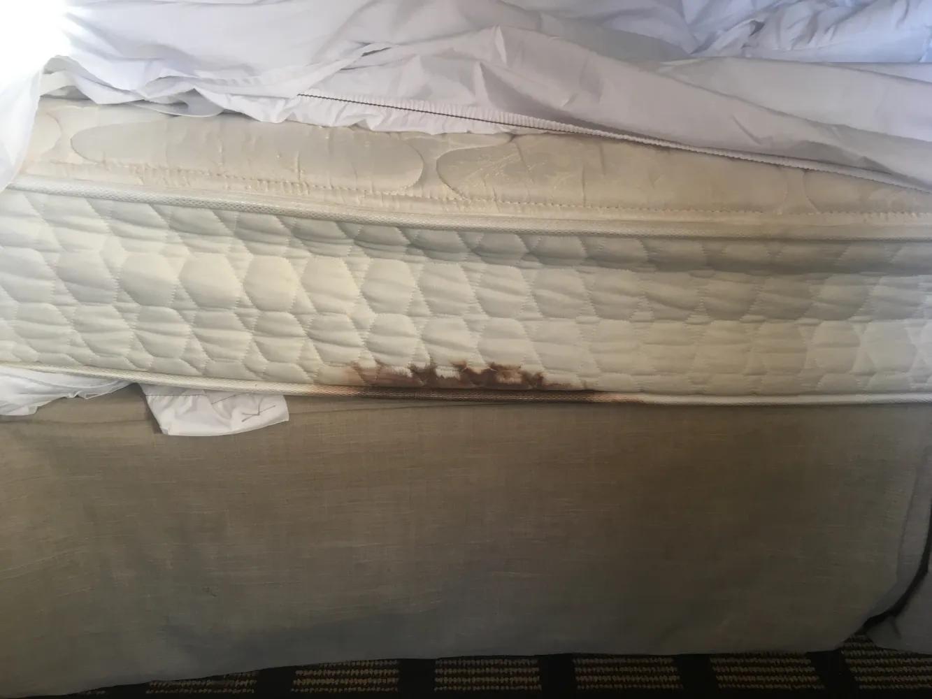 My family and I stayed in a room 219 on Saturday night the 12-15-18. We noticed the door latch was broken (see picture) and did feel unsafe while spending the night but we were already settled. That Sunday am we did notice a large brown/red stain on the mattress (see pictures) it also had a foul smell to it. That Sunday am I went down to the front desk to...