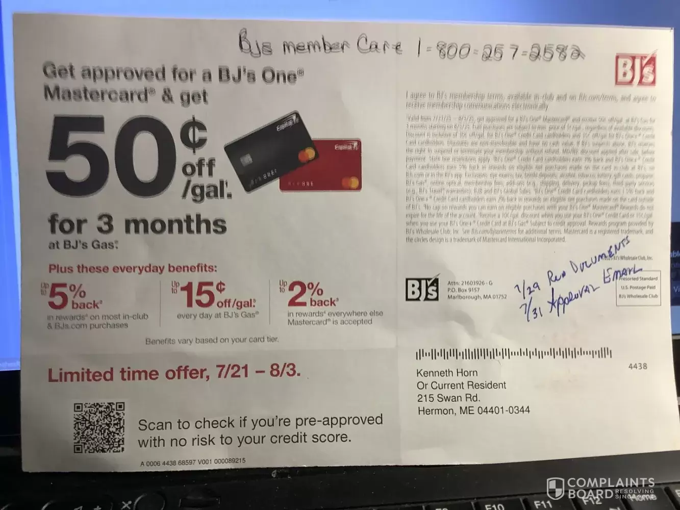 It was: “get approved for a BJ’s one Mastercard and get 50 cents off per gallon for 3 months at BJ’s gas”.