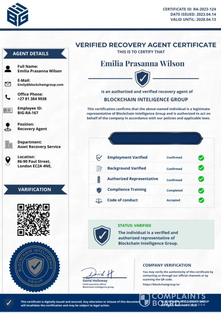 A certain person by the name of Emelia Prasanna Wilson used Blockchain to sell a story to me saying that she is a recovery agent for lost wallet assets recovery. She asked me to pay R 2500 to create a new wallet and to secure and start with on chain verification process.She inicially said to pay R20000 and when I said I don,t have that said only the R2500 to start the process and she will try and organise a deal with HQ They thensaid they will pay 40 persent and I should pay 60 percent. Their amount being R7500 and mine R10000. When the assets are then paid I can then just pay them from my wallet the 7500 that they paid for me to verify the transaction from my designated recovery wallet to my original wallet, which I assume will never happen.She even sent me a certificate as a proof that she is a recovery agent for Bockchain