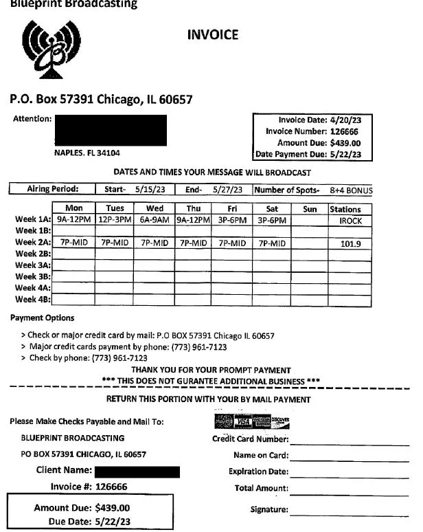 This company has no ties to radio stations at all. Their webpage is super basic and also not secure. They lie about doing the broadcasts. Lucky for me I was able to catch this prior to them broadcasting and I sent them a lengthy email to let them know about all the shadiness. I looked into both the radio stations that they promised to play on and neither of them have any links to Blueprint broadcasting nor show their logo on websites. Their website does not list the stations they control as a matter of fact. The next day they contact me to address this concern by giving me 3 free days at no charge. Except they had already promised that at the sales call. The invoices didn't match what was promised either. I told them I wanted them to cancel due to my research and the supervisor tried to tell me he can't cancel the broadcast. To which I retorted, well yes you can, you told me last week that it's all recorded live so you can just tell the guy reading it to not read it. Since I emailed them and tried to call multiple times prior to the first broadcast time, I decided to listen to the 3 hour time block and not once did the ad play, as a matter of fact the only ad that played was at the end of the block and it was for a different company altogether. The supervisor kept insisting that they were light but had no answer to why the radio stations I talked to had no idea who they were. Lucky for me I had multiple screenshots and proof of their scaminess. And I recorded the entire phone call, so when he finally said ok we won't run the ad and you won't be charged or billed. I was able to say Great, thank you, I have you on record saying that. He said that all these 1 star reviews on here are people that just didn't want to pay their bills. But in my case I canceled prior to the run time. I sincerely hope that there is someone that is doing research on them after a sales call and is able to use this to save them the trouble and headache. Also, please contact your local radio stations and let them know.