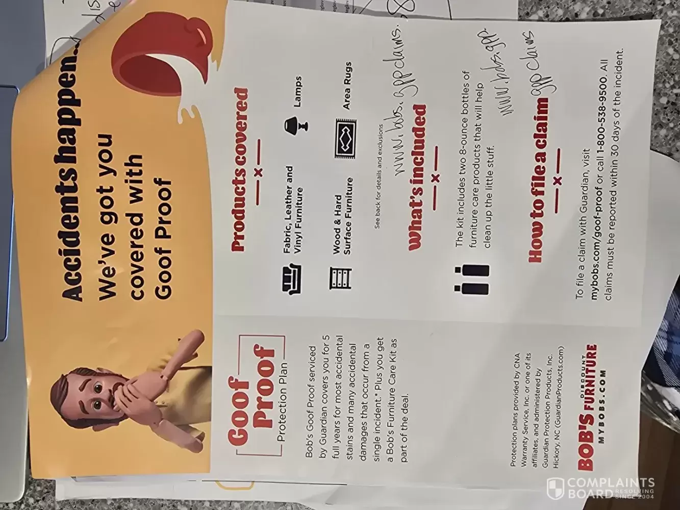I paid $376.60 extra on an enormous counter table that by itself cost $1,199.00, because I was told it would cover damage done by anything. So I thought it would be worth the investment. Actually, my table was damaged in one of the legs within a year of purchase because my puppy chewed it. I felt that was on me, so I did NOT make a claim for that. But about a week or two ago, I was cleaning the table (eith Murphy's oil) and realized that one of my kids left a cup or something on the table after I washed the area and it left a ring (see attached). I called the "Goof Proof" insurance (Guardian Products) denied my claim. Good Proof is a scam -don't invest in it. I am notifying the BBB. Also, I'm looking into how to obtain information from the company to see what percentage of claims are honored versus not honored, so perhaps ai will need to file a consumer complaint to get that information and to request treble damages. In case anyone else is having the samw issue and wants to consider doing the same.