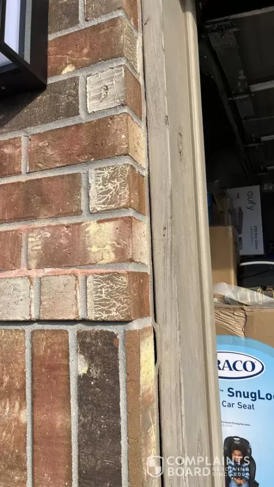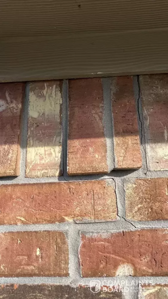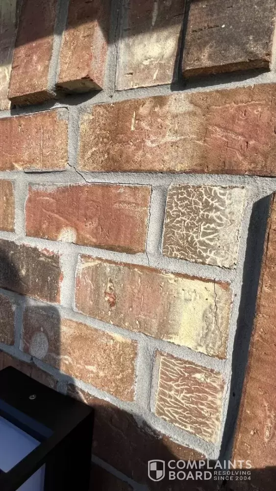 • A vertical crack in the exterior brick near a corner of the home, extending from an exterior light fixture upward toward the transition between the first and second floors, measuring approximately 1/8 inch at its widest point.