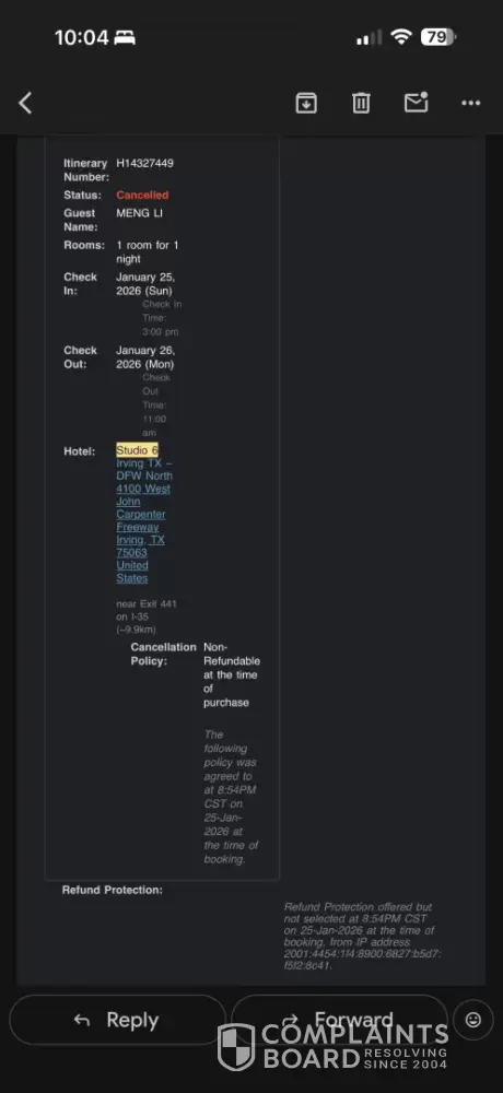 I canceled my reservation at Studio 6 because the condition of the hotel was unacceptable and there were roaches in the room. I immediately contacted bookonline.com, and they canceled the reservation and confirmed that I would receive a refund. I also received a cancellation confirmation email.