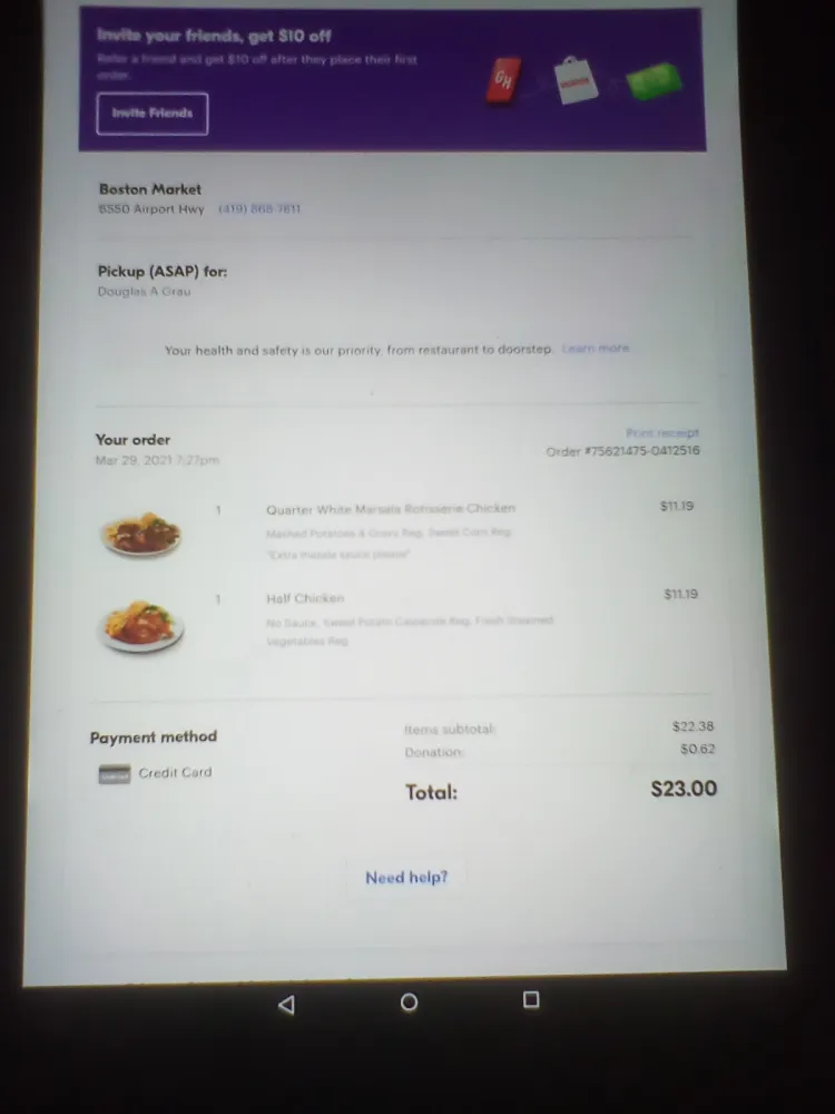 Please note the time of this email, we have not yet received this order or have not been contacted by Boston Market.
