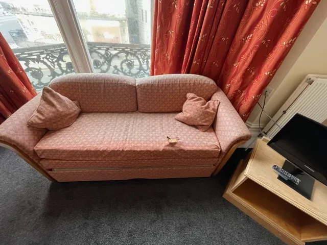 You could hardly see out the windows to the sea view because they were filthy inside and out. There was paint peeling off the woodwork of the windows onto the carpet. The curtains were shabby and wouldn't meet in the middle which meant your room was lit up at night by the street light. The beds (twin again) were more than firm and should have been thrown out years ago. The sofa bed in the room was stained and had a rip in it and when I pulled the bed out to take a look it was stained and was in a pretty disgusting state. The cushions on the sofa bed were flat and stank of damp. Only one of the bedside lights worked. The headboard was one just hanging on t the wall. The TV was so small you couldn't see anything on it from the other side of the room. my laptop has a bigger screen. The room hadn't been cleaned properly there was dust on the top of the wardrobe and pictures and fittings. The radiator was in a poor state.