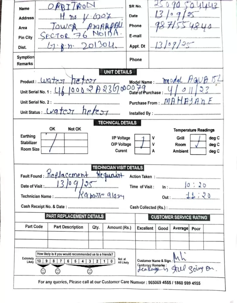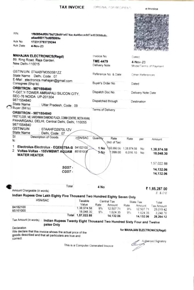 Dear Sir/Madam, we have bought the water heater from Mahajan Electronics, 89 Ring Road, Raja Garden, New Delhi 110015 invoice no. TME-4479 Dt. 04/11/2023 qty. 3 nos. for Rs. 18,048.30. We were told that all complaints will be resolved within 24 hrs. and warranty stands for 24 months. As our geyser started leaking from body and service engineer visited more...