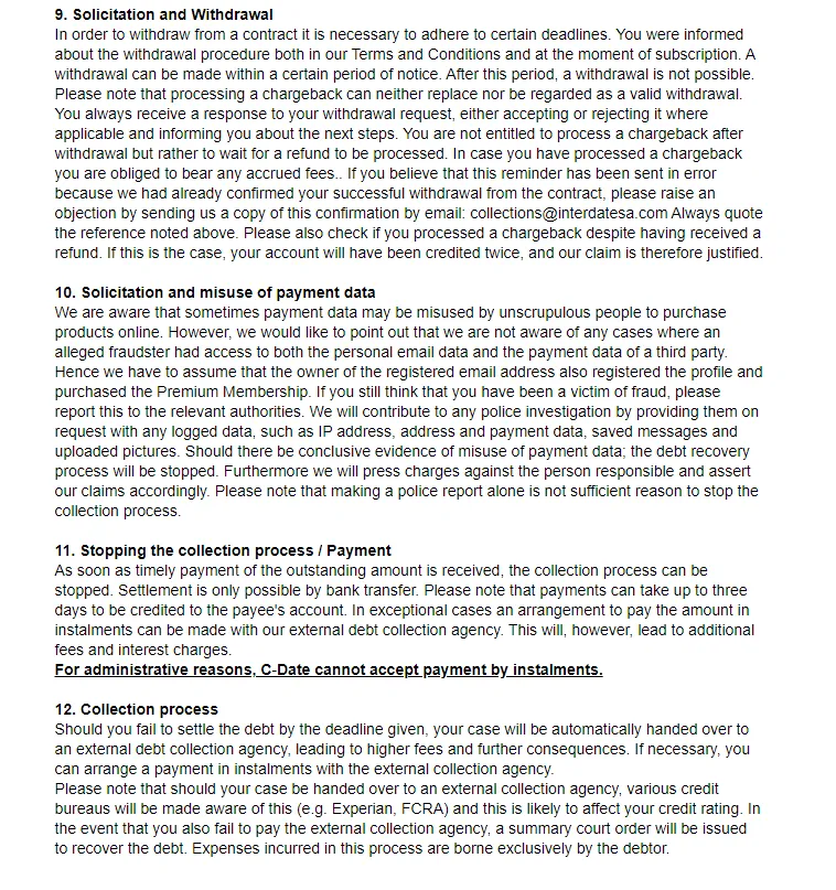 Desired outcome: Have the amount written off, and have my account with C-Date be deleted