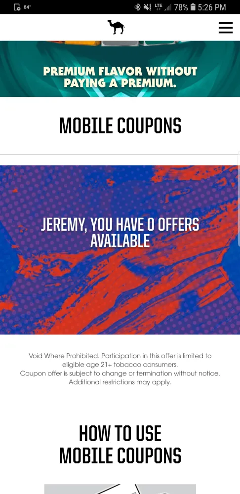 I haven't been able to get/use mobile coupons in a week. Usually, I'd get 2 coupons per week, but this week my account shows "0 offers available." Seriously, Camel, what's the deal? Surely you must appreciate your faithful customers who help keep Big Tobacco rolling in the billions... (yes, billions with a "B.") I honestly don't expect a rapid response, but, hey, what do I have to lose? Definitely not mobile coupons...